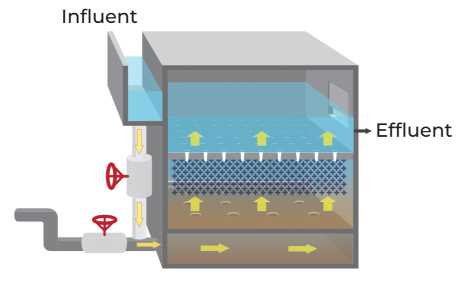 Raw wastewater enters the Proteus reactor through the feed header, spreads across the EPP media bed, and flows upward through each cell, where solids are retained and the filtered effluent exits through the effluent channel.