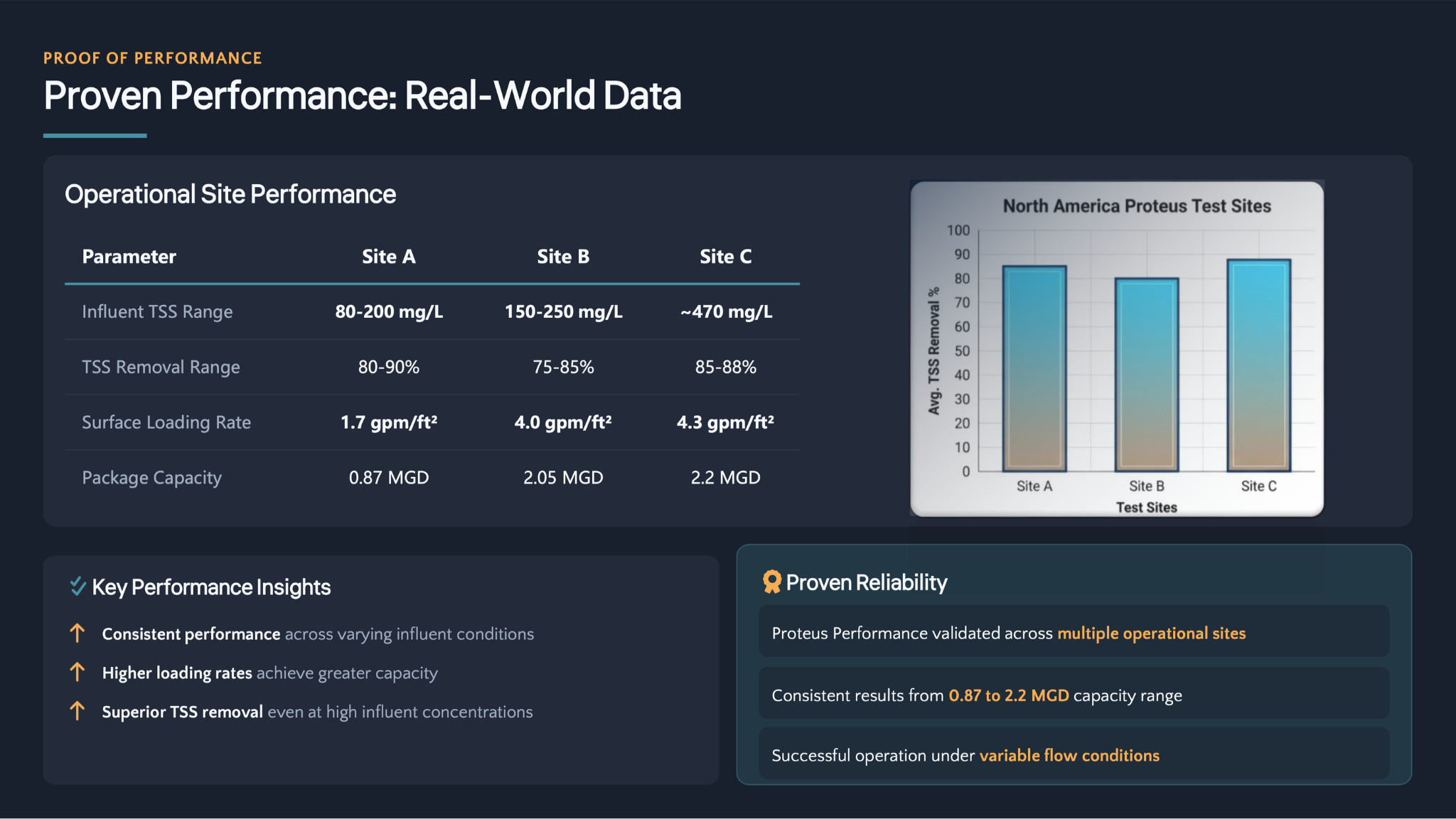 PROTEUS® Primary Package is designed for up to 2.2 MGD under primary operating conditions and can accommodate flows beyond 2.2 MGD during peak wet‑weather events, while maintaining over 75% TSS removal, all within an exceptionally compact footprint comparable to a 40‑ft container.