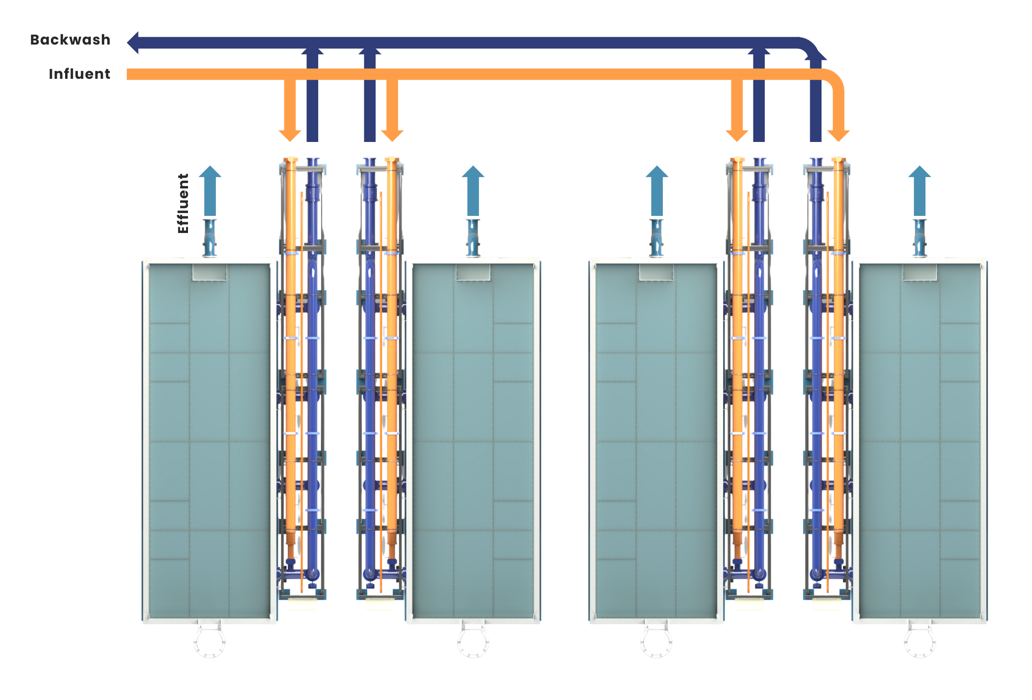 Backwash starts automatically when media headloss or pressure reaches its set limit. Influent valves close, the backwash valve opens, and accumulated effluent and solids are released through the waste line. A drain–idle–drain sequence then restores media permeability and full hydraulic capacity.